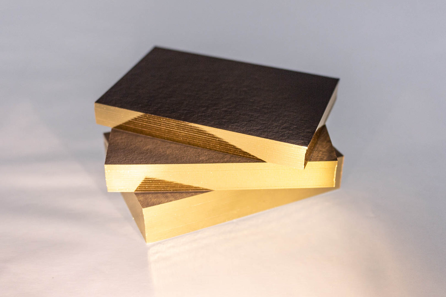 Wir veredeln auf Wunsch mit Heißfolienprägung in Gold, Silber oder Weiß; als kostengünstigere Alternative bieten wir hochwertigen Weißdruck. Ergänzend setzen wir hochwertige Kantenveredelung ein. Kurz: Nahezu alle Papierveredelungen sind auf unseren schwarzen Karten möglich.