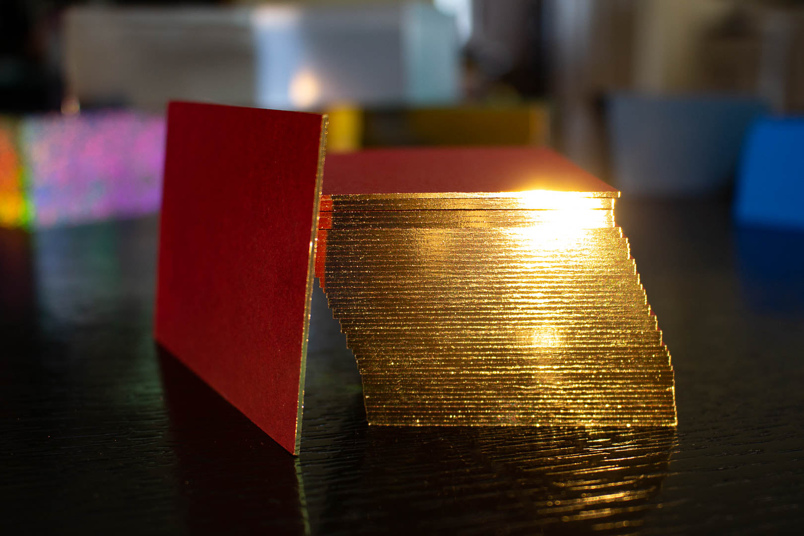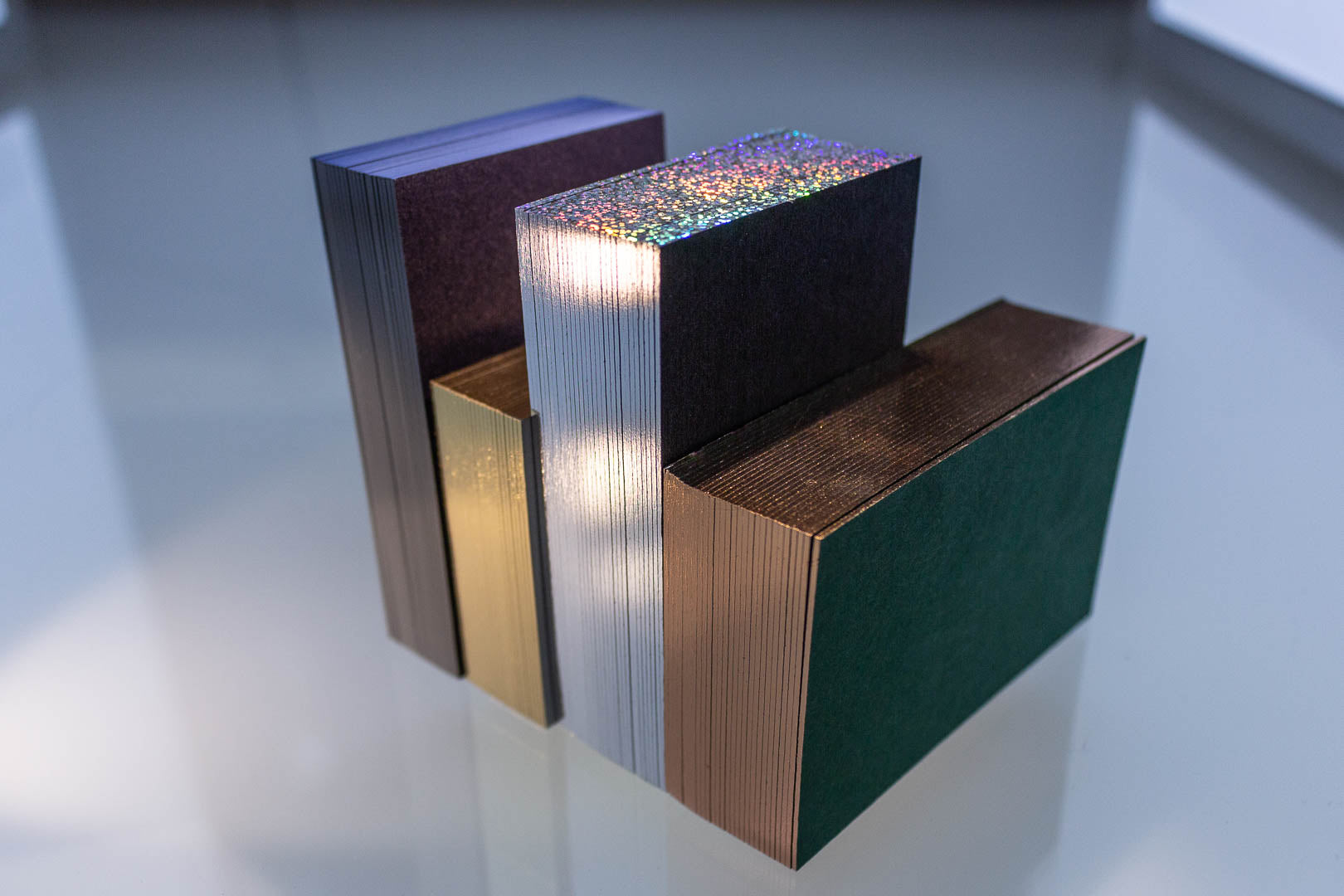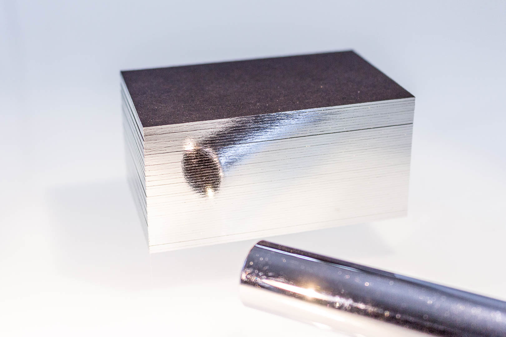 Der Folienschnitt zählt zu den edelsten Möglichkeiten, Drucksachen zu veredeln. Dabei wird der Rand einer Karte mit einer hauchdünnen Metall- oder Farbfolie versehen. Je nach Lichteinfall entstehen glänzende Reflexe, die das Design perfekt ergänzen und den hochwertigen Charakter der Karte unterstreichen.