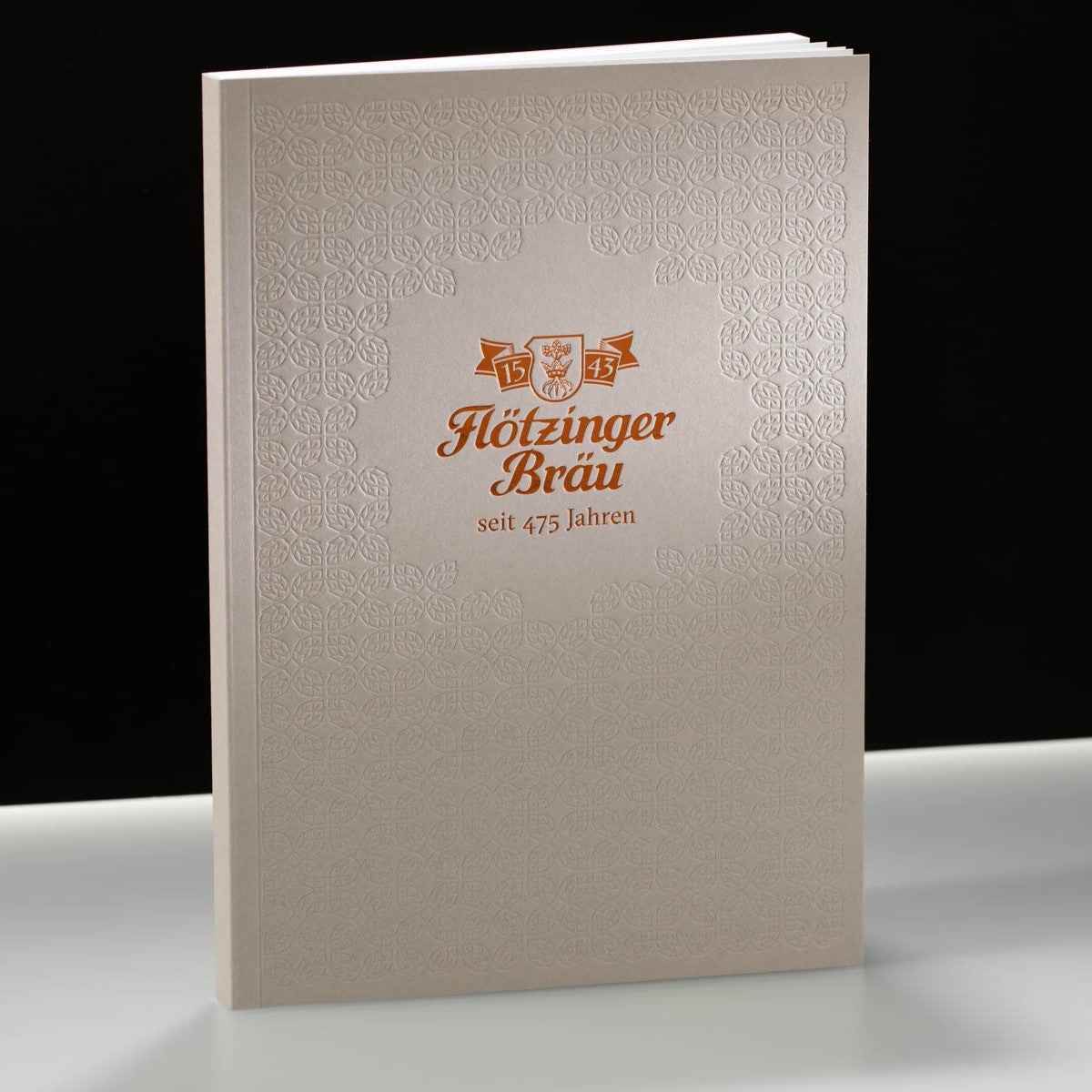 Mehr als nur ein Schreibblock: Dieses Notizbuch wurde vom Studio Frau zum 475-jährigen Jubiläum der Flötzinger Brauerei gestaltet. Der tief geprägte Hintergrund mit einem feinen Hopfenmuster im Rapport verleiht der Oberfläche Struktur und Charakter. Das Brauerei-Logo in kupferfarbener Prägung auf edlem Naturpapier rundet das Erscheinungsbild ab – eine handwerklich hervorragend ausgeführte Arbeit mit viel Liebe zum Detail. Wenn Sie ein Projekt mit einem besonderen Erscheinungsbild planen, freuen wir uns auf Ihre Anfrage. Gerne beraten wir Sie persönlich und entwickeln gemeinsam ein individuelles Konzept, das perfekt zu Ihrem Anlass passt.