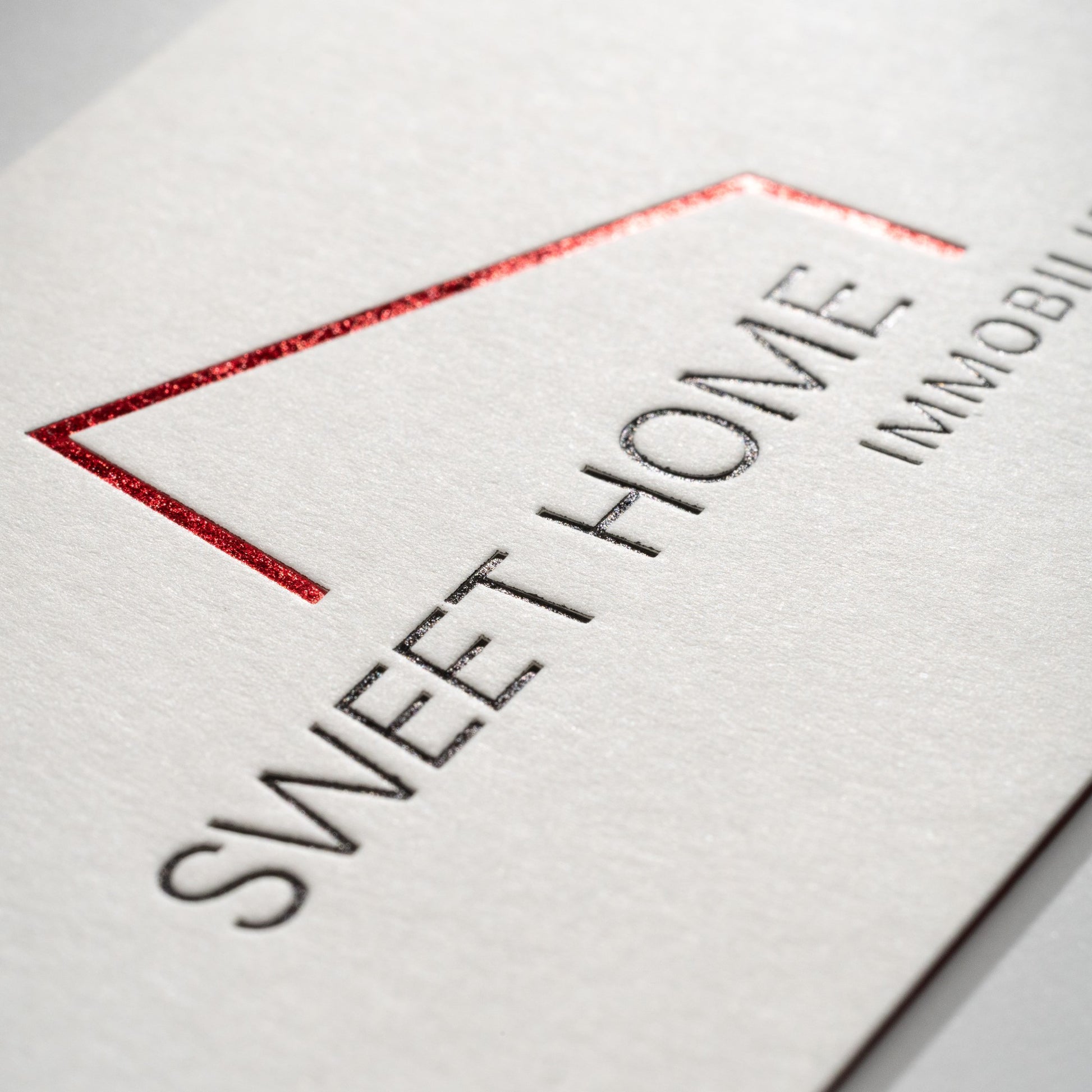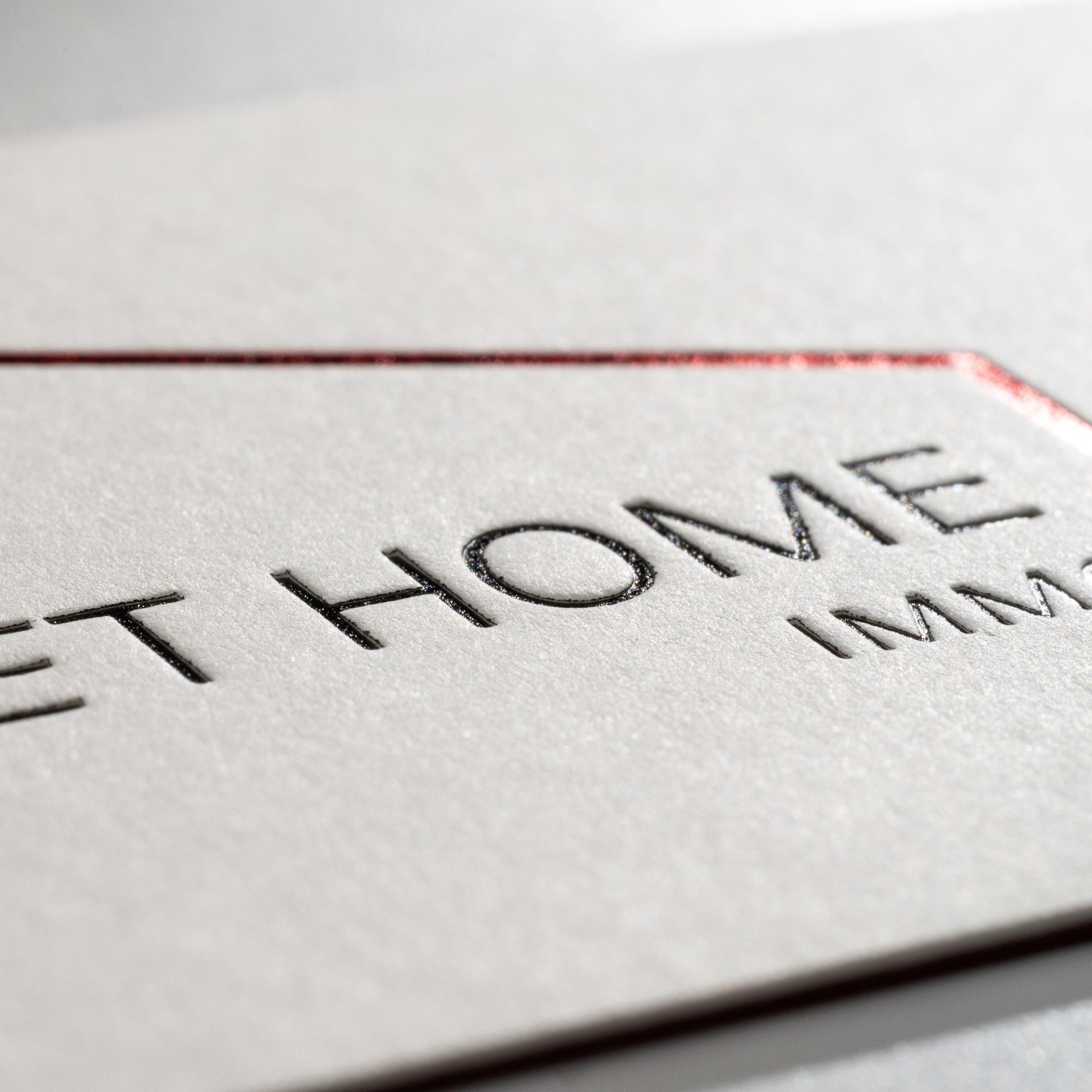 Hochwertiger Ausstattungskarton, leichtes Tiefprägen wie im Letterpress möglich, glänzende Farbfolie, beeindruckende Oberfläche.